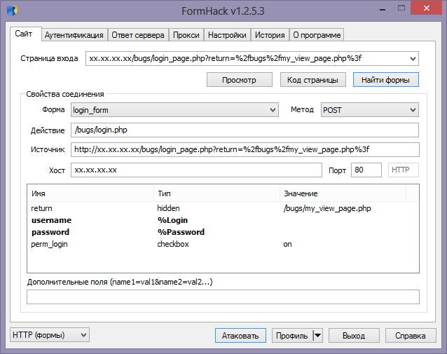 В начале каждого сеанса работы нужно загрузить в FormHack и проанализировать страницу содержащую форму для аутентификации пользователя. Переходим на закладку Сайт, переключаемся в режим HTTP (формы), водим адрес страницы в поле Страница входа и жмем Найти формы. Получаем следующее: